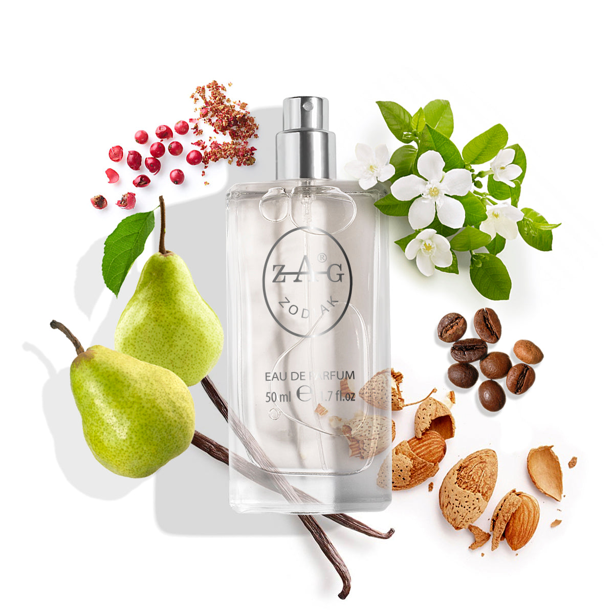 Sprankelende koffie en sappige peer openen naar een hart van zachte jasmijn en sinaasappelbloesem, rustend op een warme basis van vanille, patchouli en romige houtsoorten.